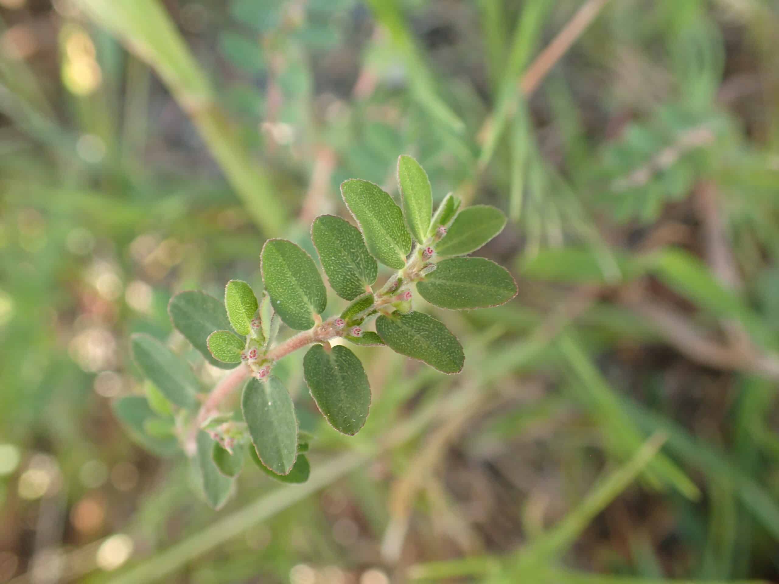 30cmほどの背丈に成長したエノコログサやメヒシバで覆われている草刈り前の公園で、それらに負けじとばかりにアレチニシキソウが生えていました。同じ公園には、北アメリカから中央アメリカ原産で同属のコニシキソウ Euphorbia maculata も生えていました。こちらは、公園の入口近くのより乾燥と踏圧が強い環境で、コンクリート脇の地面を這うように生えていました。