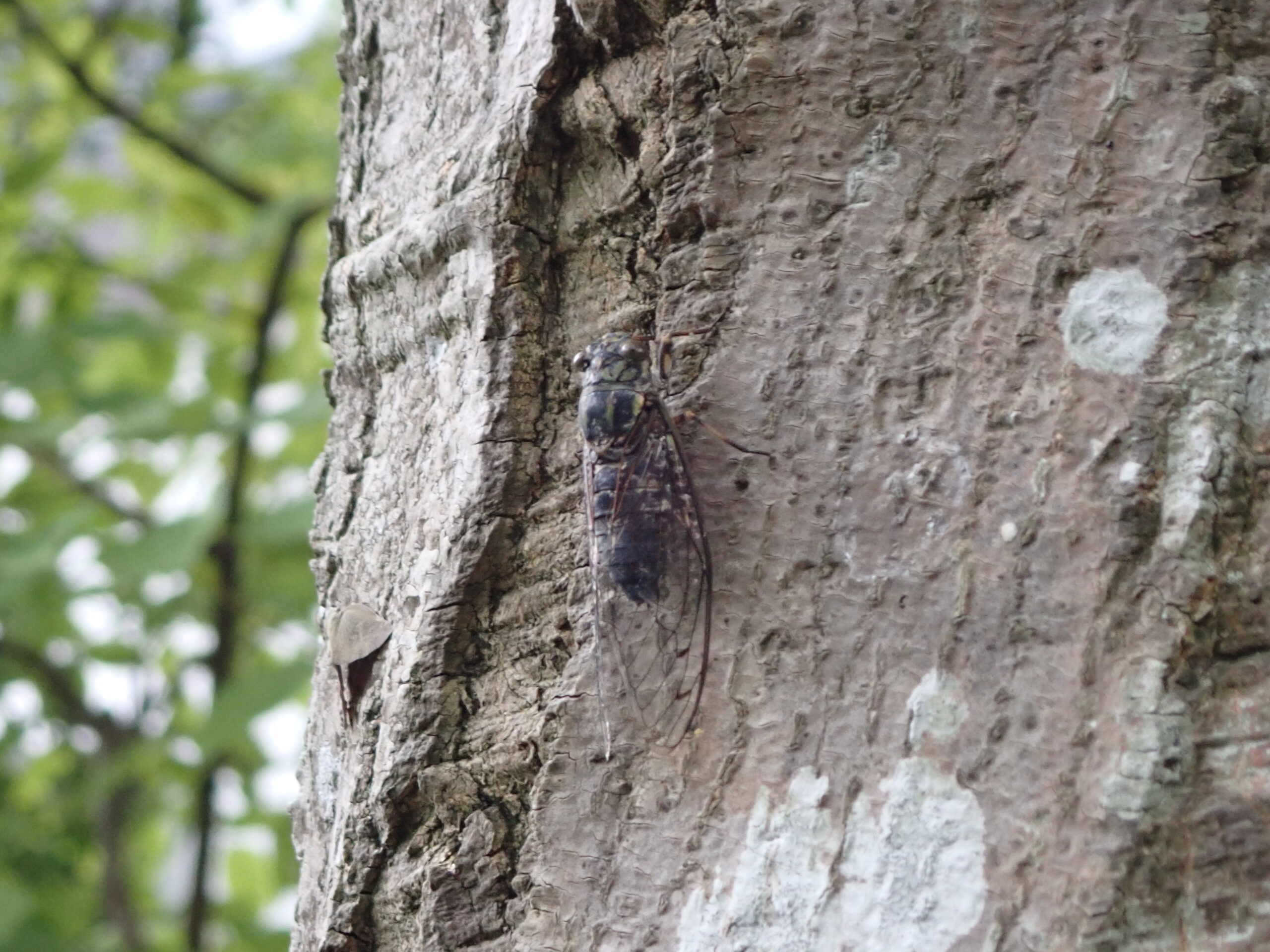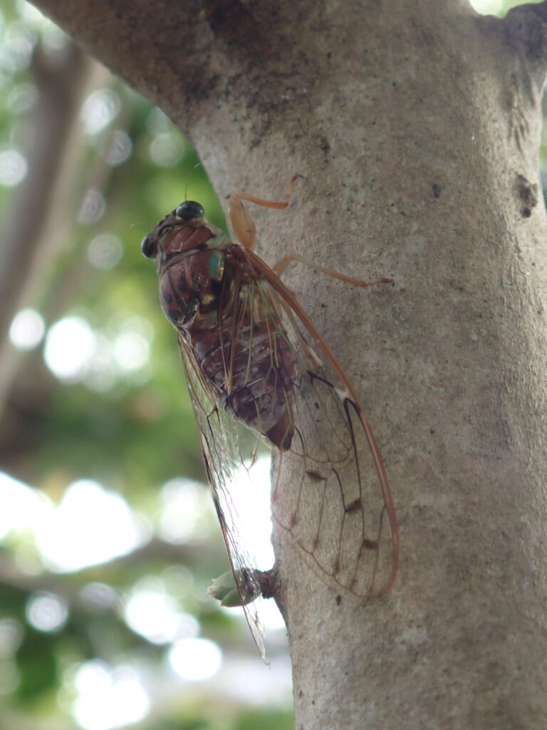 ツクツクボウシ Meimuna opalifera は、セミ科ツクツクボウシ属のセミです。体長は3cm、頭から羽の先までは4.5cmほどで、クマゼミやアブラゼミよりは小さくニイニイゼミよりは大きいです。オスはメスより腹部が細長く、メスは長い産卵管がおしりから伸びます。ヒグラシも同様の体型ですが、その他のセミに比べると細長い体型をしたセミです。東アジアである朝鮮半島、中国、台湾、日本に分布します。国内では、北海道からトカラ列島の平地から山地の森林に生息します。市街地でも声を聞くことがあります。人目に触れることが多いアブラゼミやクマゼミに比べ高いところにとまる傾向にあり、さらに警戒心が強いため、声をよく聞くわりにはあまり姿を見ないセミです。ヒノキ、カキ、アカメガシワ、シダレヤナギなど様々な樹種にとまります。