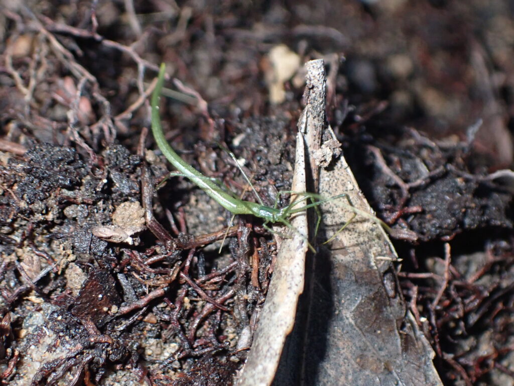 林縁の落ち葉の上を歩いているオナガグモを見つけました。長い脚をせわしなく動かして逃げようとしますが、長い腹を引きずるような感じになって、どこかまごまごした感じです。くねくねと腹が曲がり、遠目には肉食性の昆虫が青いイモムシを引きずって歩いているようでした。多くのクモは、手に乗せるとしばらく手の上でじっとするか、手の上を歩き回るかしますが、オナガグモはせかせかと歩いて、そのまますぐに下に落ちてしまいます。あまり、どこかに強く掴まる気はないようです。また、糸を使って上からぶら下がったり、いつのまにか遠くの植物の葉に引っかけた糸を伝って、空中をロープーウェイのように移動しはじめました。体が非常に細いこともあり、すぐに見失ってしまいます。歩くのはぎこちないですが、糸を操って移動するのはとても上手という印象でした。