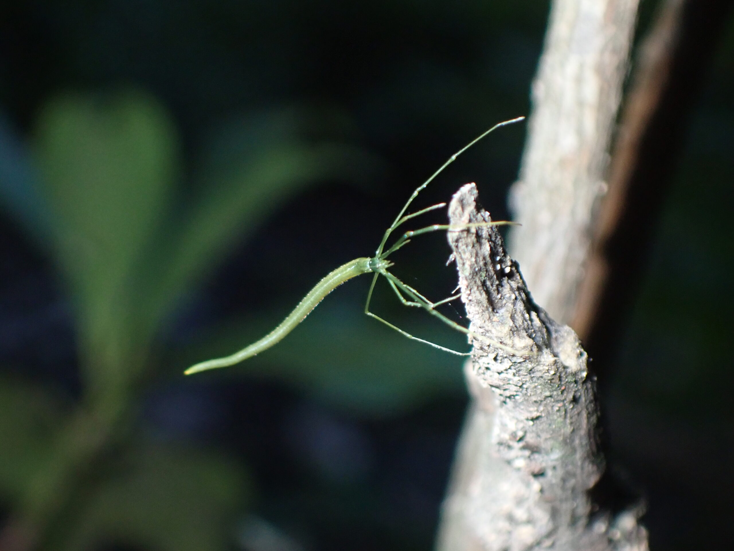 しばらく観察していると、植物の葉の先で足を前にまとめて伸ばし、一本の細い棒のようになって止まりました。この体勢が松の葉の擬態になっているのではないかと考えられることがありますが、その効果は明らかになっていません。