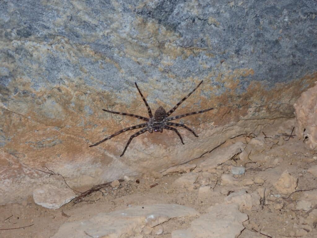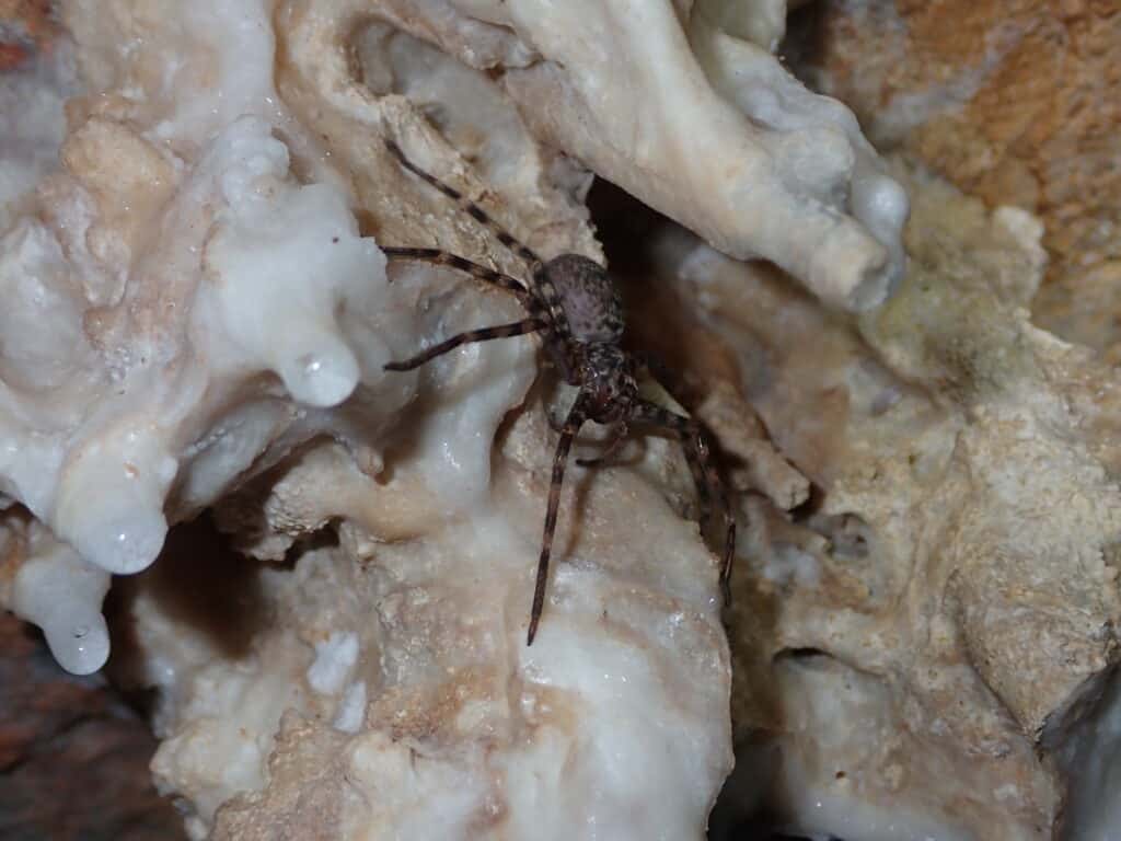 日本に生息するアシダカグモに似たクモでした。ライトで洞窟内を照らすと、キラキラと目が光るため比較的見つかりやすかったです。10平方メートルに1匹くらいの頻度で見つかりました。近寄っても慌てて逃げることもなく、じっとしているものが多かったです。見つけたものは、ほとんど地面付近にいました。