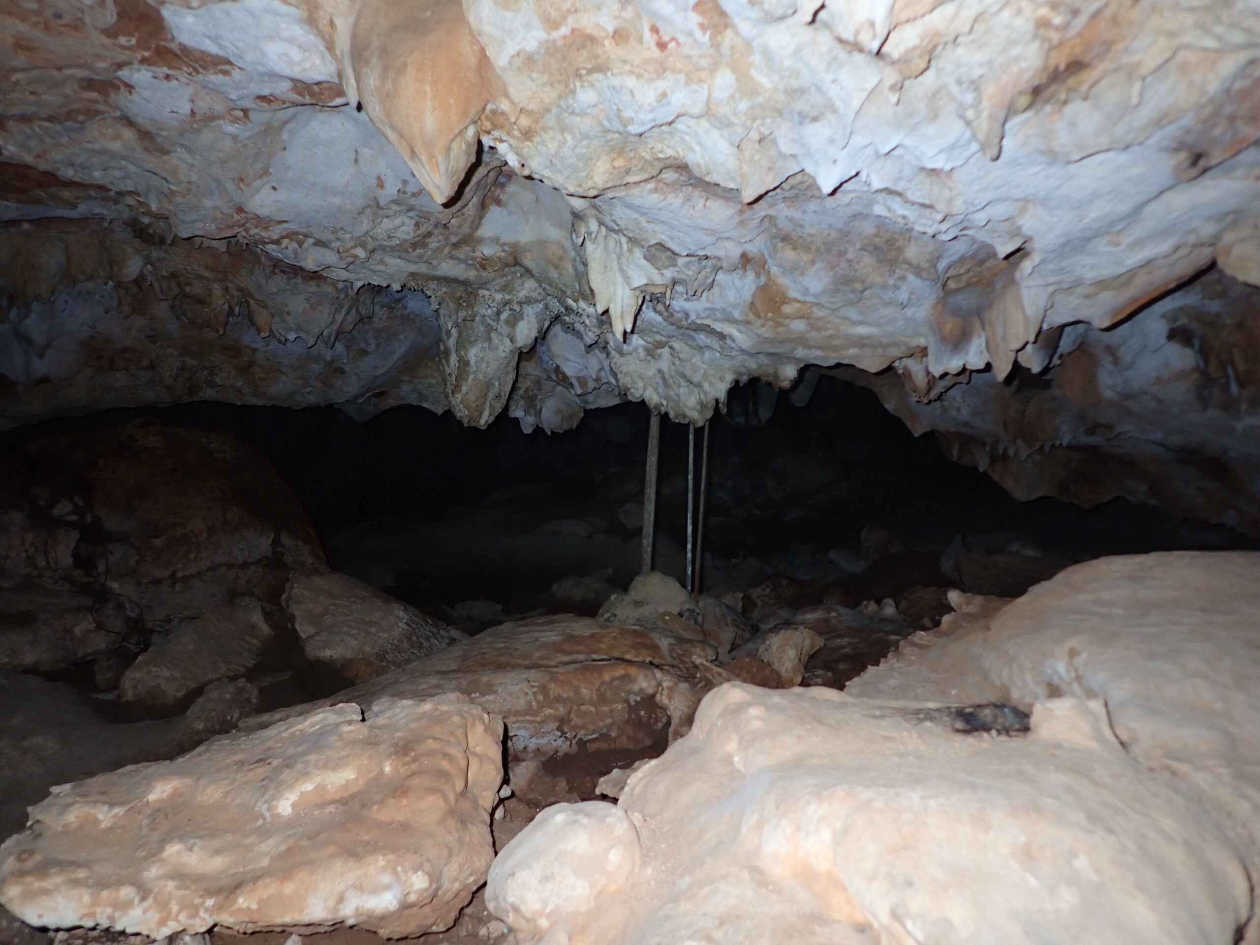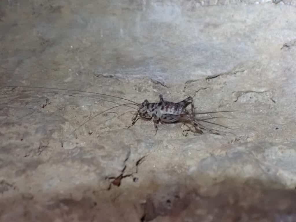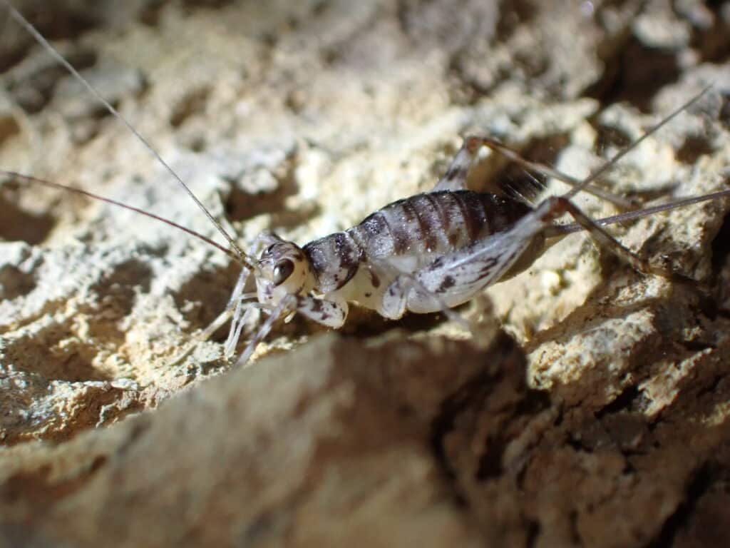 日本に生息するカマドウマに似た形態のバッタで、カマドウマと同様翅はありません。近寄っても、それほど急いで逃げる様子もなくじっとしていました。カマドウマの仲間は、腐果、落ち葉、生き物の死骸、生きた昆虫などなんでも食べる広食性の昆虫です。このバッタも広食性のため、このような食べ物が乏しいと考えられる環境でも生きられるのかもしれません。また、触角が非常に長く、視覚がほとんど使えない真っ暗闇では、非常に役立つ感覚器官として働いていると考えられます。