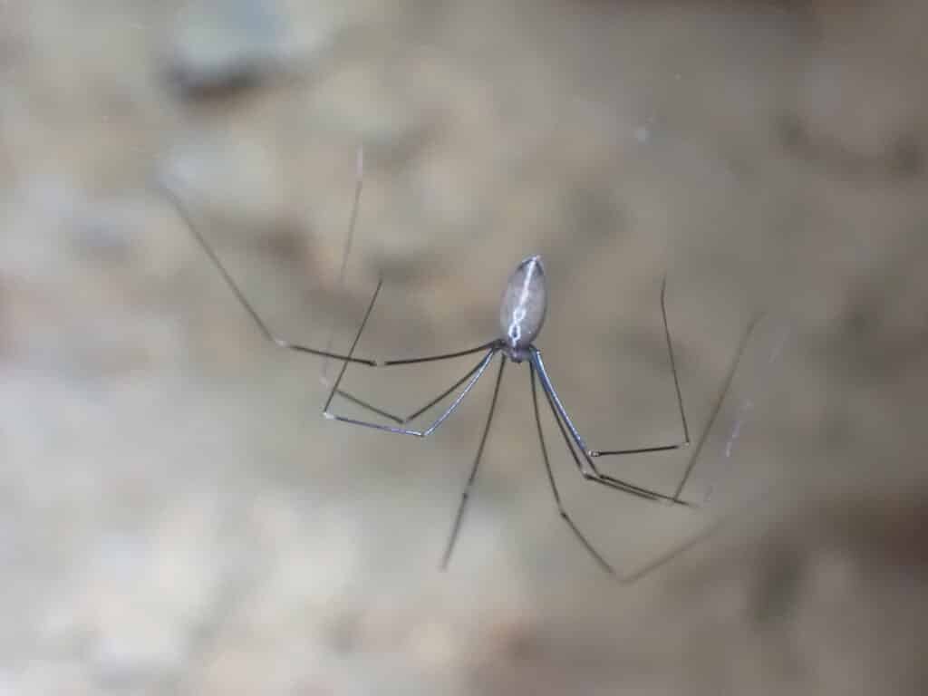 5〜7mmほどの大きさの足が細く、非常に華奢な小さなクモでした。造網性のクモというと、頭上付近に大きなクモの巣を張るイメージですが、このクモは、足元十数センチほどの高さの岩と岩の隙間に、直径15センチほどの大きさの網を張っていました。