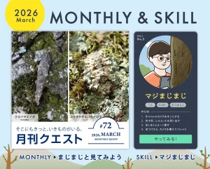 クエスト(BIOME) 3月マンスリー:「見る」にフォーカスしよう 2026.03.11 カマキリの卵を探して、限定特典を手に入れよう! 2026.03.10 【クエスト情報】春告げる花たち Spring ephemeral 2026.02.17 2月マンスリー:音をヒントにいきものを探そう 2026.02.10 1月マンスリー:「冬鳥」を探そう 2026.01.26 年間チャレンジ、特設サイト公開! 2026.01.23 【クエスト情報】観測しよう!ウメ・サクラ前線