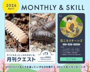 クエスト(BIOME) いきものコレクションアプリBiome 正式リリース7周年 2026.04.24 相鉄沿線を大冒険!そうてつ生きものクエスト2026 2026.04.22 【クエスト情報】蝉 ~semi~ 春編 2026.04.16 4月マンスリー:落ちている「石ころ」に注目 2026.04.07 【4/1時点】Biome クエスト紹介 2026.04.01 【クエスト情報】Flower Tree Tour 2026 2026.03.25 【クエスト情報】#ツバメ前線2026 2026.03.19 【クエスト情報】春のむしはじめ 2026 2026.03.18 3月マンスリー:「見る」にフォーカスしよう 2026.03.11 カマキリの卵を探して、限定特典を手に入れよう! 2026.03.10 【クエスト情報】春告げる花たち Spring ephemeral 2026.02.17 2月マンスリー:音をヒントにいきものを探そう 2026.02.10 12
