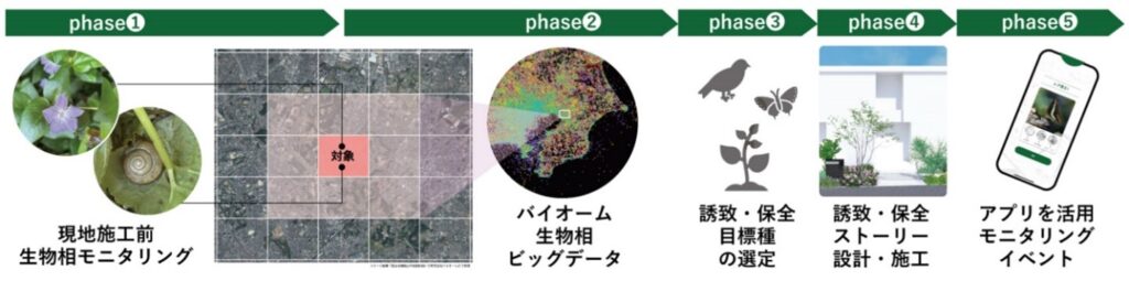 本プロジェクトは、大東建託株式会社が全国で計画・展開するまちづくりにおいて、バイオームが保有する生物多様性ビッグデータと解析技術を活用し、地域ごとの誘致目標種の選定や、それに基づく植栽提案・施工を行うものです。