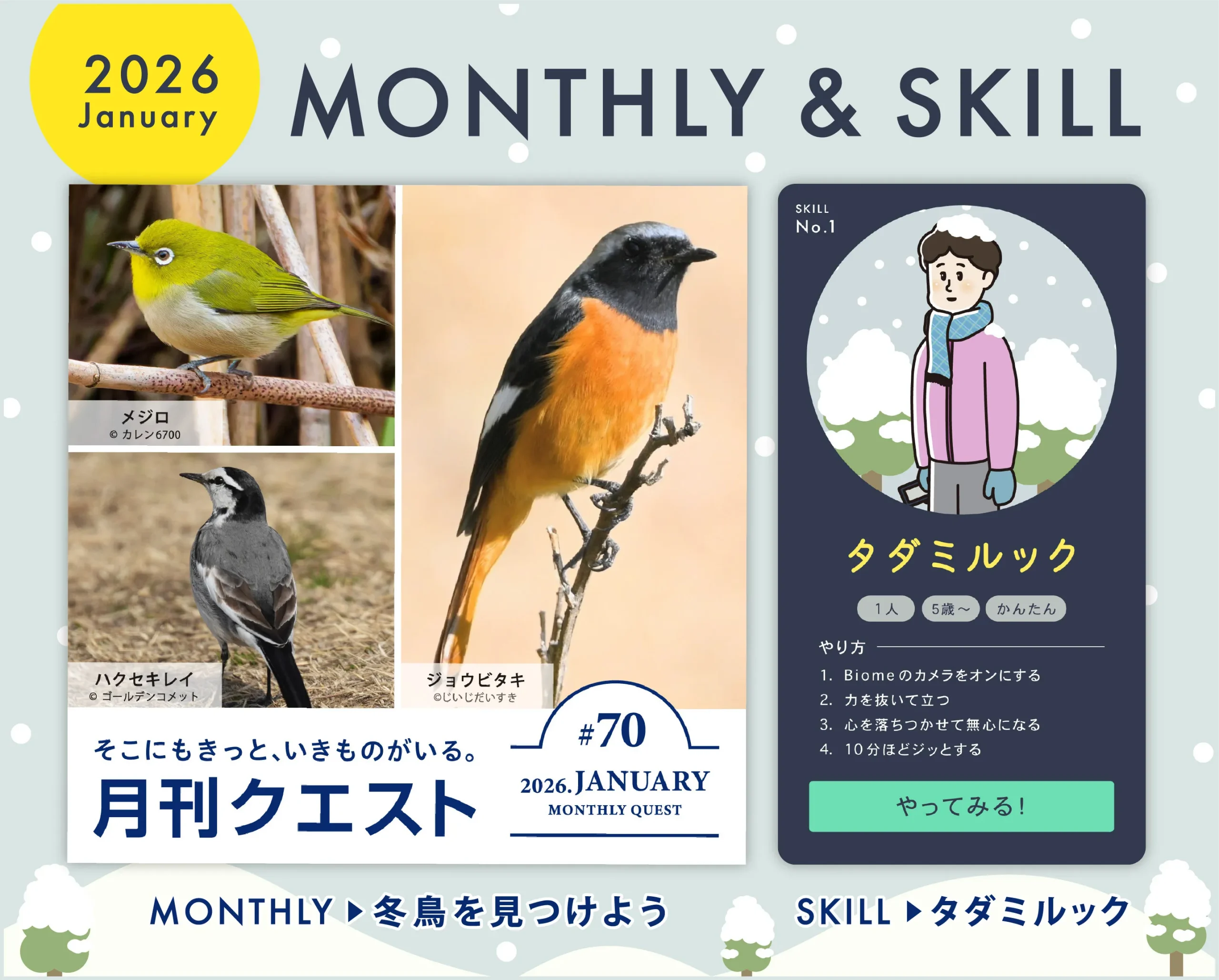 毎月1日にアプリ「Biome(バイオーム)」で配信される、初心者の方におすすめのクエストです。ミッションで指定されるいきものやエリア、また投稿数などをクリアしながら、クエスト達成を目指します。