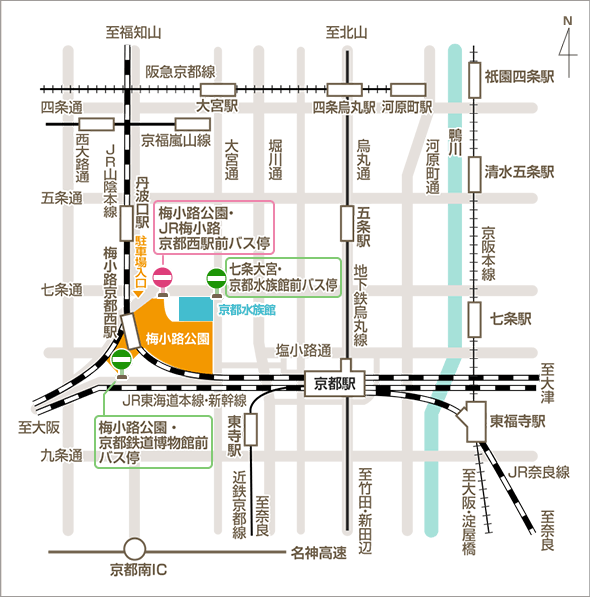 ◆市バス「梅小路公園・京都鉄道博物館前バス停」、「梅小路公園・JR梅小路京都西駅前バス停」、「七条大宮・京都水族館前バス停」下車すぐ
