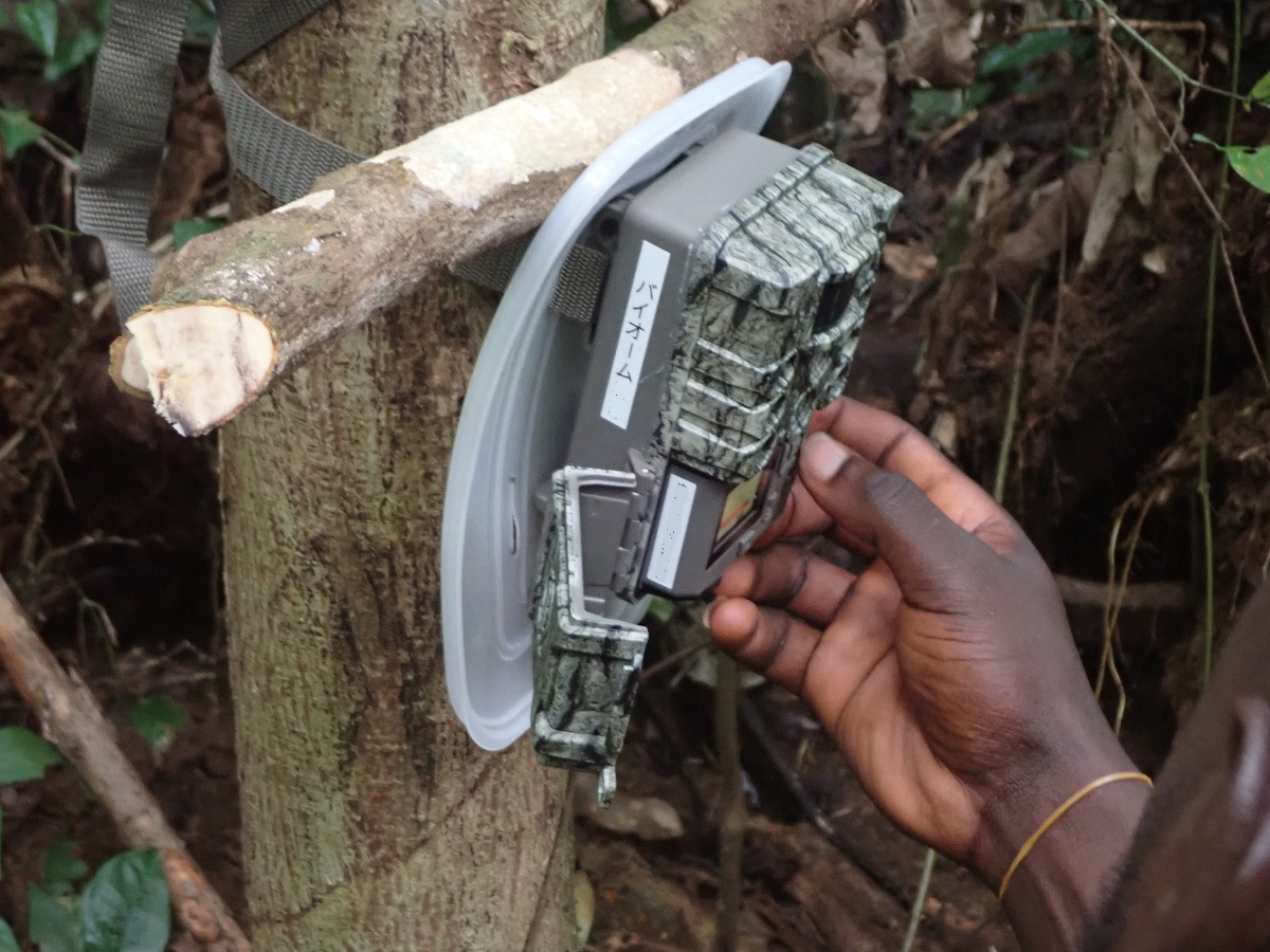 ガーナでは、上記写真のように「トレイルカメラ」と呼ばれる動物などの熱を持つ動体から発する赤外線を感知して自動撮影するカメラを用いたカメラトラップを仕掛けるなど、本格的な調査を実施しています。