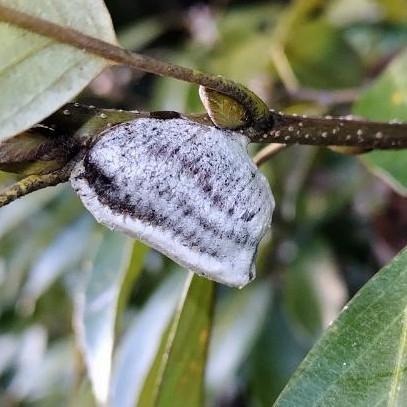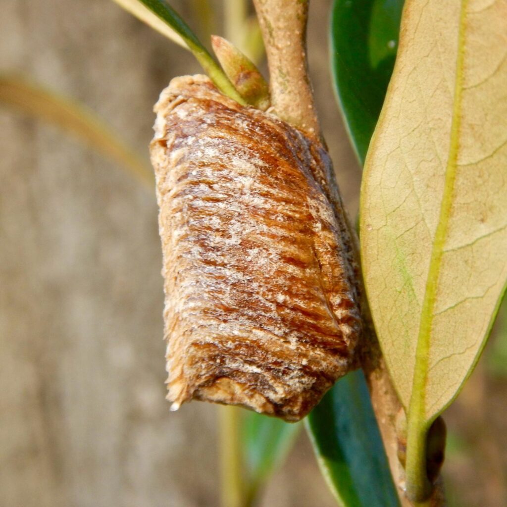 他の種と異なり、植物の枝や茎を挟むようにして産みつけられる事が多いです。
