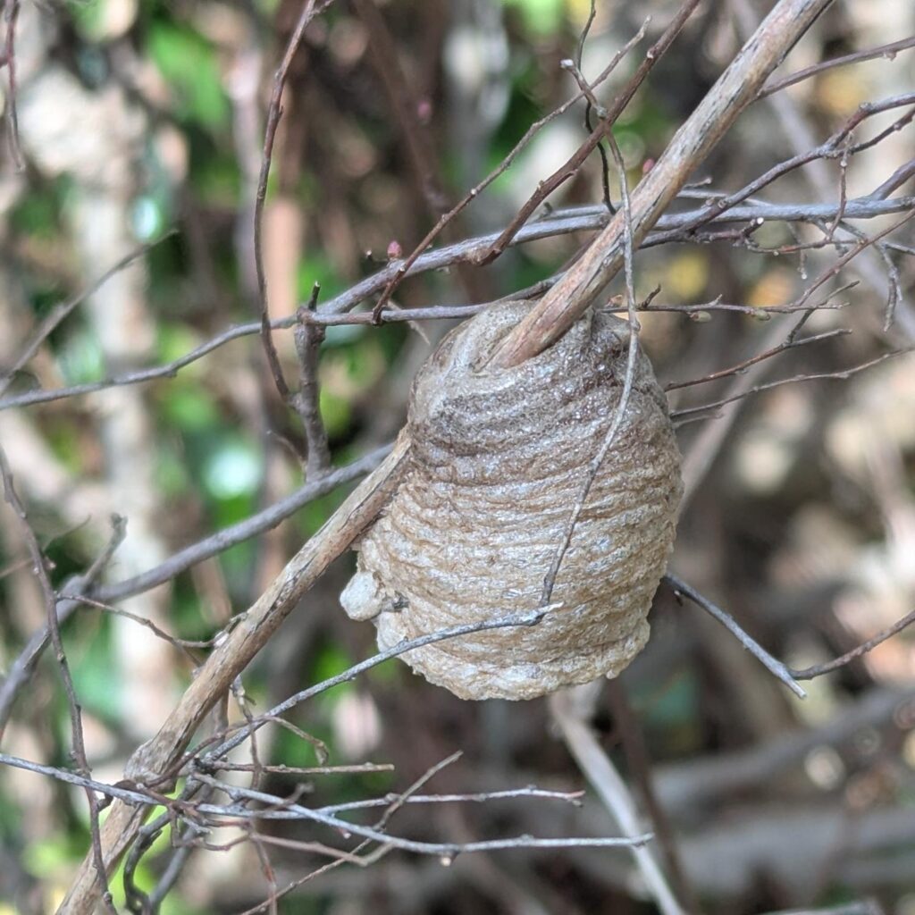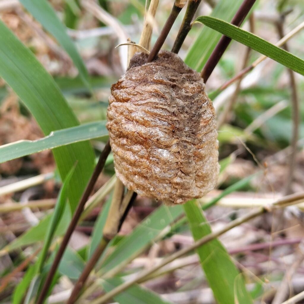 冬場に散歩していると、枯草や木などに茶色っぽい塊が付いていることがあります。これはカマキリの卵。