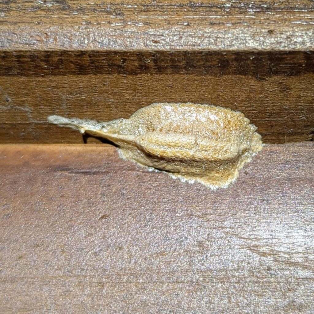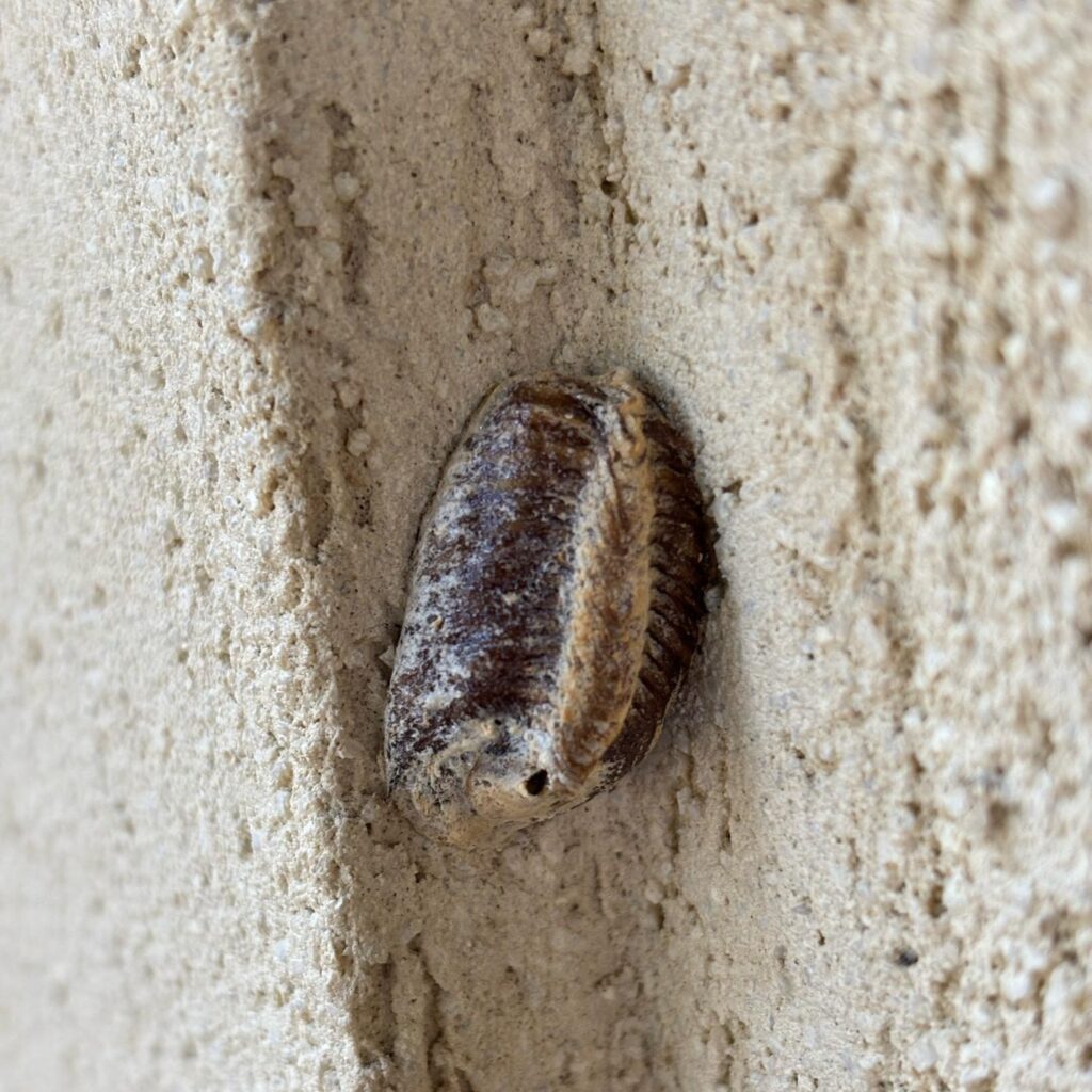 コカマキリの卵鞘は、地表近くの石や木などの物陰に加えて、人工物にも産みつけられることが多いです。卵鞘の大きさは2~3cmほどと小さめのサイズで、細長く薄い形状が特徴です。