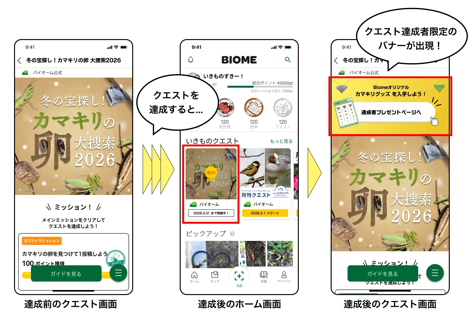 アプリ「Biome(バイオーム)」で、クエスト「冬の宝探し!カマキリの卵 大捜索2026」が2026年3月31日まで配信中です。