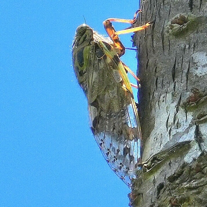 ハルゼミと同じく透明な翅をしていますが、体には緑色や褐色の模様があり、成熟したオスはお腹周りが橙色〜橙褐色でツヤっとした光沢があるのが特徴です。