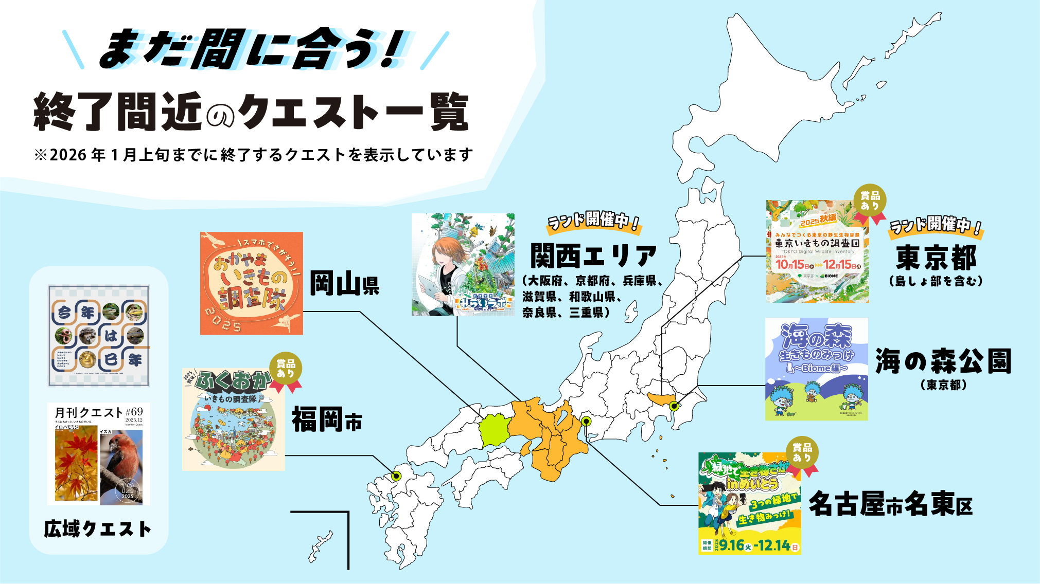 関西一円の自然の「いま」を、みんなで一斉に調査しよう!地元のまちから話題の公園まで、さまざまなエリアで観察を楽しみながら、全6個のクエスト達成を目指してください。